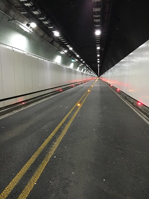 Mount Victoria tunnel on SH1 leading from Wellington Airport into the city, is relatively short at 623m, but a very busy tunnel. The bi-directional, single bore tunnel with no emergency exits required an inteligent lighting system. The use of on-road LED markers and tunnel guidance markers ensures the road edges and lanes are clearly defined at all times. In the unlikely event of a fire within the tunnel, the lighting system will switch to evacuation mode based on the fire zone detected, and cause a pacing sequence towards the nearest and safest tunnel portal.