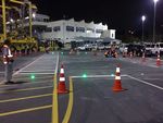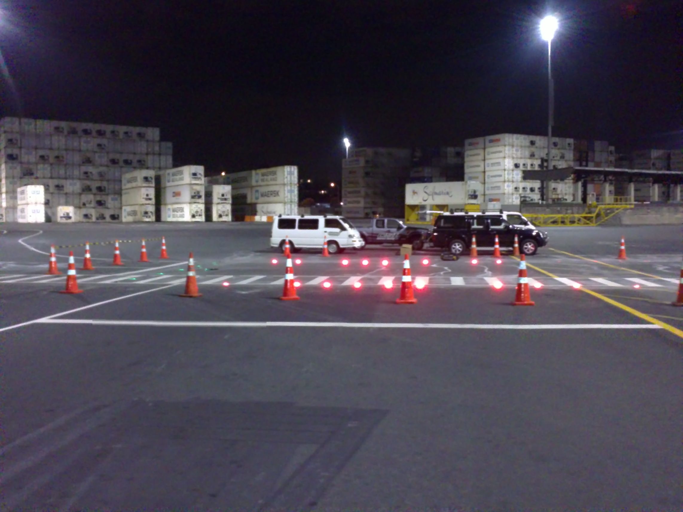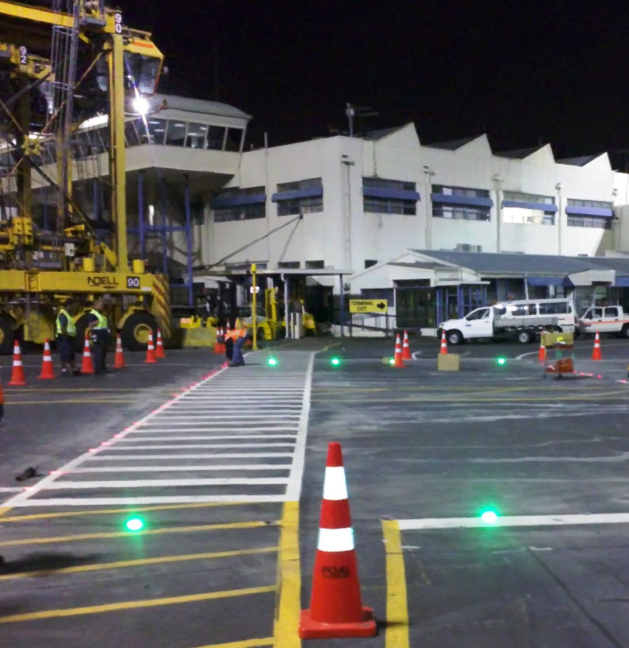 3i Traffic was approached to deliver a customised lighting solution to enhance safety at a principal crossing on the Auckland Port premises. 3i Innovation used an intelligent system. The solution is based on 65 inductively powered, flush mounted road marker with bi-directional red and green LED lights. The warning lights along the pedestrian crossing are activated by push buttons at each end and complemented with traffic signals. Service vehicles will also trigger the system when driving over inductive loops installed at the cross roads.