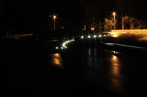 LED markers are used to illuminate the edge of roundabouts, especially where little or no overhead lighting is available. In Aldigen, Germany, the local council had issues with truck drivers passing through the roundabout and driving over the centre island. With the introduction of on-road LED markers there have been fewer accidents of trucks driving onto the kerb. First system was installed in November 2013.